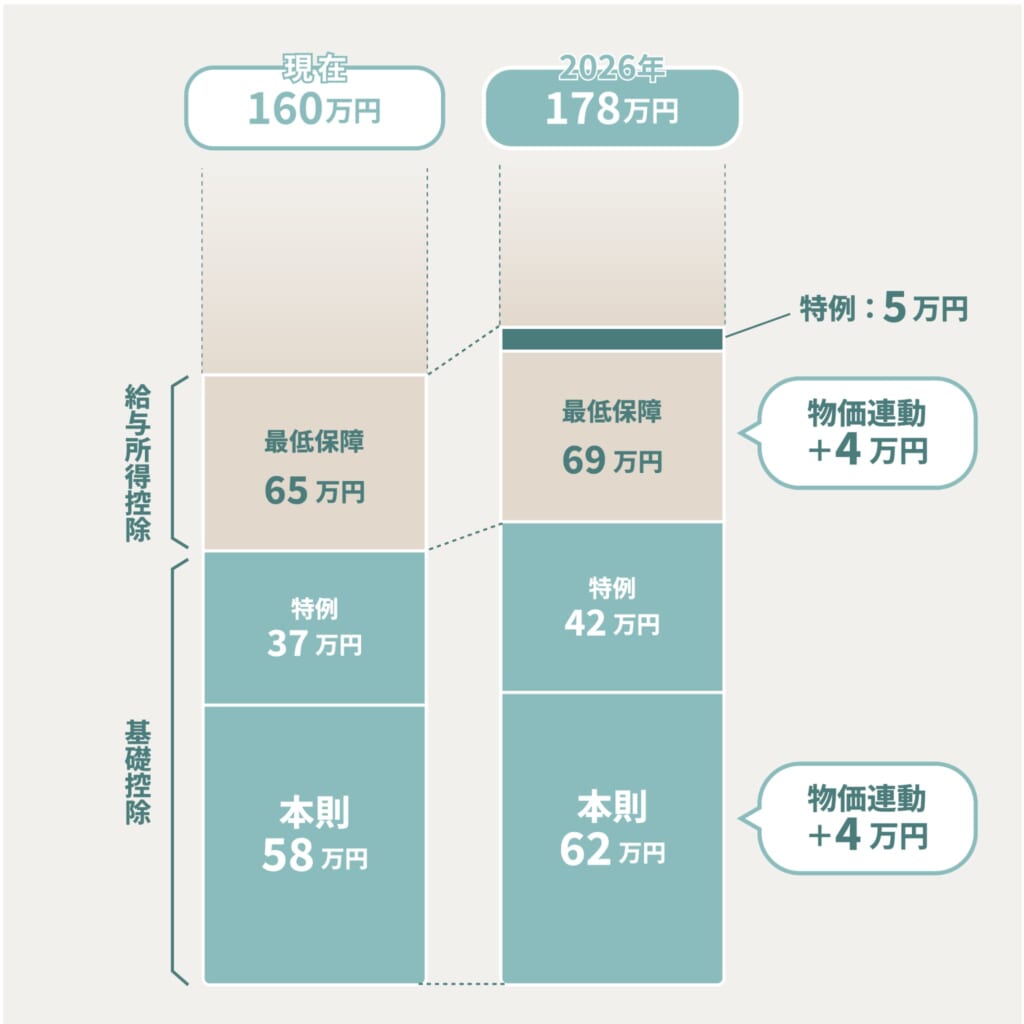 - 2026年(予定)これを178万円まで引き上げる予定です。つまり、178万円までは所得税がかからなくなるんです。